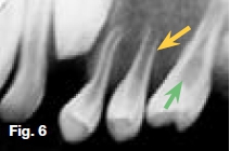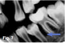 Hypovitaminosis D leads to nondeposition of calcium salt in bone matrix. Figure 5 is a lateral skull radiograph showing generalized radiolucency while figures 6 & 7 are intra-oral and bitewing radiographs of the same patient showing large pulp cavities (green arrow) and attenuation of the lamina dura and dental crypts (yellow arrow). There is also lack of mineralization of the alveolar crest bone (blue arrow). These radiological features are suggestive of Vitamin D-resistant rickets which is an isolated renal tubular defect inhibiting reabsorption of inorganic phosphates, resulting in hypophosphaturia which is inherited as an X-linked dominant trait. The full manifestation of vitamin D-resistant rickets is rickets or osteomalacia non-respondent to vitamin D therapy, as vitamin D metabolism is normal. However, there is diminished intestinal calcium and phosphate absorption. Patients with the milder form may be slightly shorter than normal siblings, with no other manifestation. Females with vitamin D resistant rickets tend to show fewer signs and symptoms than do their brothers.