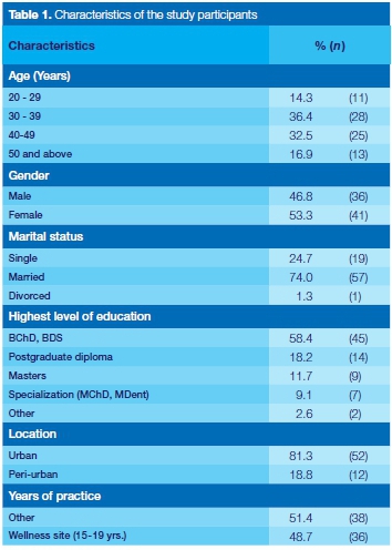 Of the sample of 100, 77(77%) participated and of these 53% (41) were female. The ages ranged from 20 to 69 years, with 69% in the range between 30-49 years, while 74% of the respondents were married (Table 1).