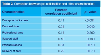 Perception of income, relationship with patients and personal time were significantly associated with job satisfaction. Intrinsic factors such as helping patients and seeing patients satisfied with their treatments contributed to satisfaction.