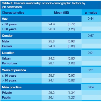 Participants with practices in the peri-urban areas reported better job satisfaction than did those in the urban area. However, gender and number of years of practice did not have any association with job satisfaction (Table 3).