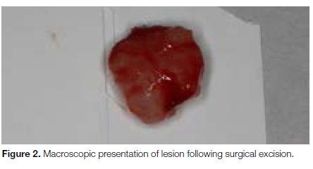 She had no significant medical history and her extra -oral examination revealed bilateral submandibular lym-phadenopathy. Intra-orally, a 15x15mm exophytic soft tissue lesion was seen on the lower labial mucosa, across the midline. The lesion firm, broad based, non-tender on palpation and was the same colour as the surrounding mucosa (Figure 1).