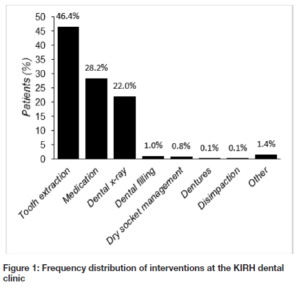 Only a small number of patients (0.2%) received no intervention/treatment on the date of their visit, the vast majority received at least one intervention; 12.1% had 1 intervention, 85.8% had a combination of 2 interventions, and 1.9% had 3 interventions. The most common interventions (Figure 1) were tooth extraction(46.4%), medication (28.2%), and dental x-ray (22.0%).