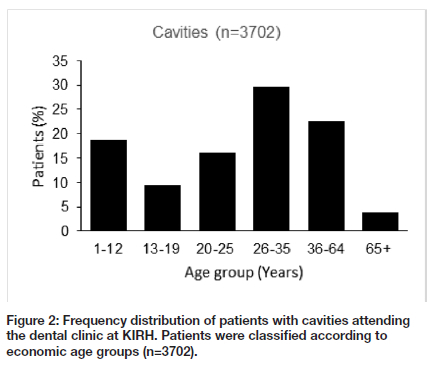 In this study, the interventions made on outpatients who attended a dental clinic at a major state hospital in Windhoek (Namibia) were studied and the pharmaceutical costs associated with treating each of the mostly presented oral health diseases were estimated. At KIRH, 74.6% of the patients who visited the dental clinic received an intervention that involved the use of pharmaceuticals (Figure 1). The total annual cost of pharmaceuticals required to treat patients at this dental clinic was estimated at US$11,143.38 which is 0.4% of the hospital's entire budget allocated to pharmaceuticals in 2021. The hospital at which this study was conducted is one of the two largest state hospitals in Namibia and it is unlikely that the proportion of pharmaceutical costs for dental interventions at this hospital would be the same at all the other state hospitals around the country, therefore generalizing this figure to be true at the national level is a limitation. Nonetheless, using this figure of 0.4% and taking the reported national annual expenditure on pharmaceuticals for Namibia as US$58,300,000.00,6 the corresponding national cost on pharmaceuticals for treating oral health diseases would be inferred to be around US$233,200.00, of which roughly US$220,600.00 goes to treating cavities alone. Since cavities were the most commonly presented condition, as is reported globally,10-12 it is not surprising that such a high proportion (94.6%) of the estimated pharmaceutical costs at this dental clinic were due to treatment of this disease. The majority of patients with dental caries in this study were adults (68.2%), followed by children (18.6%), adolescents (9.5%) (and a small percentage were elderly (Figure 2). These demographics suggest that oral hygiene seems to be better in the high school age group (13-19 years old) in comparison to pre-primary and primary school children (1-12 years old).