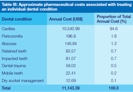 Disease conditions due to infections were treated with combination therapy (taken orally) of amoxicillin (or cefuroxime) + metronidazole + paracetamol for 5 days while pain was managed by common analgesics mostly paracetamol and/or ibuprofen for 3-5 days. The calculated pharmaceutical costs for the 4,050 patients (excluding 58 which were counted as 'Other') was US$ 3,482.31 over the study period. Adjusting this figure to include all the 6,516 patients who presented to the dental clinic during the six-month study period and projecting the costs to 12 months (13,032 patients) brings the total annual pharmaceutical costs at this clinic to approximately US$ 11,143.38 which is 0.4% of the total pharmaceutical budget for the entire hospital. Disease conditions that incurred the highest annual pharmaceutical costs were cavities (dental caries), pericoronitis, and abscess (Table 3).