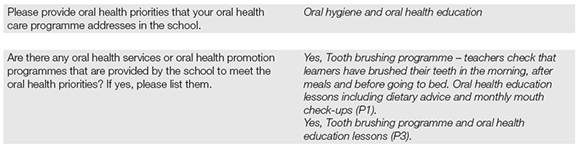 Many interviewees stated that oral hygiene was a priority in their schools. This was addressed in a variety of ways by educators' efforts to promote learners' oral health, including: providing oral health education and dietary advice in the health education lesson or life skills lesson, supervised tooth brushing programme, in which educators frequently check that learners have brushed their teeth in the morning, after meals and before going to bed for those who are boarding. Pain management and oral examination was only offered by a few schools