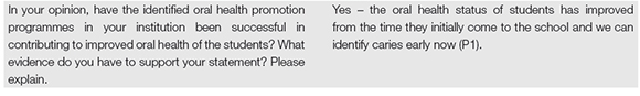 Interviewers from schools that provide oral examinations agreed there was generally low to moderate dental caries prevalence and low prevalence of periodontitis, gingivitis and oral lesions. Medical records of learners kept by the schools were the only epidemiological evidence available to corroborate the prevalence of oral diseases at the schools.