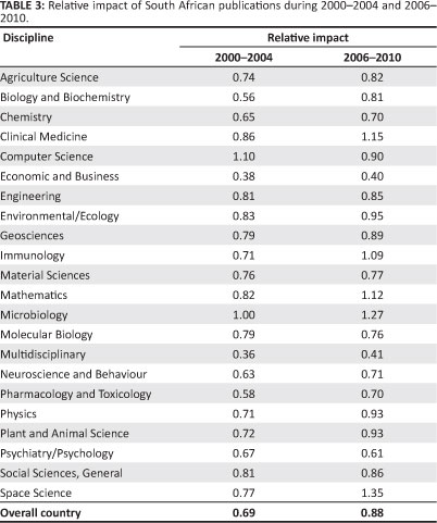 Table 3 shows the relative citation index (an indicator of research quality) of the various disciplines for the periods 2000-2004 and 2006-2010. An index of one means that the average South African article in the particular discipline attracted the same number of citations as the average article in the discipline in the world. Only three disciplines out of 22 appear to have deteriorated during the period - Computer Science, Molecular Biology and Psychiatry/Psychology. The country's relative citation index has increased from 0.69 during 2000-2004 to 0.88 during 2006-2010.