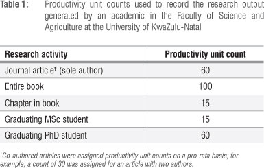 At UKZN, the productivity unit counts that appear in Table 1 have been used to unbiasedly apportion a 'unit of worth' to a published piece of work. This approach differs from that of most other studies in which each article that has been published is usually weighted by the journal impact factor which measures the average number of citations a journal paper will receive in the first 2 years following its year of publication. Because the focus in this study was to identify specific factors that affect the production of research rather than on the quality of this research, a 'unit of worth' was chosen to use as a measure, but it can be noted that the method to be outlined can just as easily be applied as an impact factor adjusted response variable. This response variable was then rescaled using the following rule so that it better fitted into the model paradigm outlined in the previous section for a zero-inflated Poisson model: