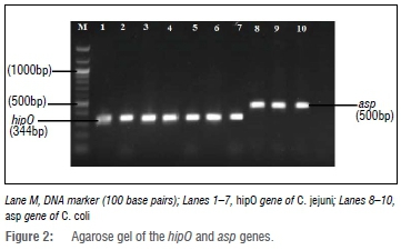 In this study, Campylobacter was isolated from 24 of the 408 (5.9%) chicken cloacal samples. However, of the samples inoculated, growth was observed in only 198 (48.5%), and out of this number, 126 (63.6%) were presumptively identified as Campylobacter based on growth on selective media and colony morphology. Isolates that presented with the characteristic mucoid cream to pink colonies (Figure 1) were tested using species-specific primers. The isolated DNA was tested for the presence of bacterial 16S rRNA gene fragments and all 126 (100%) presumptive isolates were positive - an indication that the genetic material was all from bacterial sources. Results of the PCR using specific primers showed that only 24 of 126 (19.0%) presumptive isolates were Campylobacter species; with 21 (16.7%) and 3 (2.4%) possessing the hipO and asp genes, respectively, specific for Campylobacter jejuni and Campylobacter coli, respectively (Figure 2).