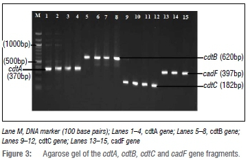 To identify the virulence determinants of Campylobacter species isolated from chicken cloacal samples, four genes (cdtA, cdtB, cdtC and cadF) were targeted. The cdt gene is responsible for the expression of the cytolethal distension toxin which induces cell cycle arrest and promotes DNA damage.34,35 Consequently, its presence is associated with the severity of Campylobacter disease in humans. Figure 3 shows the amplification of the virulence genes of C. jejuni. In this study, the cdtB gene was detected in all (24, 100%) Campylobacter isolates while cdtA and cdtC genes were detected in 83.3% and 75% of the isolates, respectively. These results concur with the findings of studies by Gonzalez-Hein et al.36, Carvalho et al.37 and Casabonne et al.38 who detected cdtB genes in all Campylobacter species isolated from various sources. In contrast, Montwedi and Ateba25 reported relatively lower detection rates of cdtA (18/50, 36%) and cdtC (9/50, 18%) genes from chicken meat samples. The cadF gene encodes a protein that interacts with the host's fibronectin, consequently playing an important role in the adhesion and colonisation of the bacterium in the host's gut. In this study, the cadF gene was detected in the majority (18, 85.7%) of C. jejuni isolates, in line with previous studies which revealed close to 100% detection of the cadF gene.36,38,39 However, none of the C. coli isolates from the present study showed the presence of the cadF gene, possibly because only three C. coli isolates were tested. Despite the importance of the cadF gene, other genes such as the flaA and ciaB genes (not investigated in this study) are equally important in the adhesion, colonisation and, consequently, survival of bacteria in the gut.38