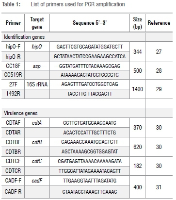 Virulence gene determinants associated with pathogenesis in Campylobacter species were determined by specific PCR analysis using the primers listed in Table 1. Cycling was performed using a DNA thermal cycler. The conditions for amplification were the same as those for the identification genes, except for cdtC and cadF genes, which were annealed at 50 °C.