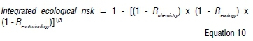 Finally, the integrated ecological risk number (between 0 and 1) for the chemistry, ecology, and ecotoxicology LOEs was calculated per site per sampling interval as follows: