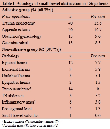 METHOD: Prospective cohort study between 2013-2014. Adult patients presenting with SBO were included. Demographics, clinical details, investigations, operative findings, in-hospital progress and outcomes were documented