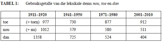 Die belangrikste gebruiksveranderinge (beskryf in afdeling 3) wat toe, nou en dan ondergaan, is 'n afname in algehele gebruik (nou, dan) en veranderinge in temporele gebruik (toe). Ter verklaring van veral die genoemde afnemende gebruike word die toenemende gebruik van 'n aantal meer spesifieke temporele adverbia ondersoek, asook die relevante sosio-kulturele konteks van Afrikaans gedurende die eeu wat ondersoek word. Met die aanvanklike en voortdurende standaardisering van Afrikaans word die verwagting geskep dat daar toenemend wegbeweeg sal word van situasie-afhanklike en betrokke taalgebruik (sien Biber 1998:148). Dit kan verdere implikasies hê in terme van toenemende verformalisering3 van Afrikaans, in teenstelling met die toenemende verinformalisering ("colloquialization") van Engels (Mair 2006:204).