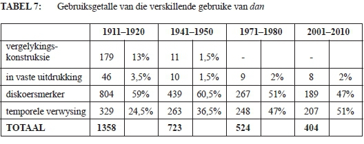 Die getalle van die verskillende gebruike van dan word in tabel 7 gegee.