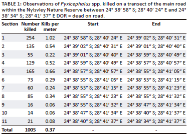It has been estimated that roadkill can significantly influence certain amphibian populations. Hels and Buchwald (2001) reported that up to 10% of certain populations of Rana temporaria (Common Frog) and Rana arvalis (Moor Frog) were killed annually through vehicle-induced mortalities. Smith and Dodd (2003), over a period of 1 year, found that 91% of all mortalities documented on a single road were herpetofauna, of which the majority were amphibians. Similar results were found by Glista et al. (2008), where 95% of all roadkill were reptiles and amphibians. The findings of the present study suggest that Pyxicephalus spp. may be particularly vulnerable to roadkill at certain times of the year. Similarly, a study assessing amphibian roadkill in the north of the Limpopo province found that P. edulis roadkill densities were among the highest of all species observed (Hlatshwayo et al. 2022). Areas of concern are likely those where breeding and tadpole metamorphosis takes place. This was presumably the case within the first section of the transect at NNR, where both roadkill and live estimates were elevated. There are many variables that could influence congregations of metamorphs, with the most likely being that this area was the most suitable breeding ground during the season.