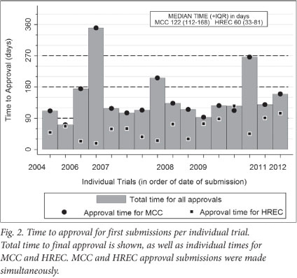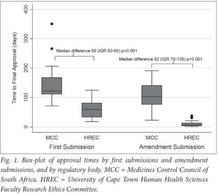 Approval time was defined as the time between date of protocol submission and the date on the letter confirming approval. In the case of the MCC, applications were delivered via courier to the MCC offices in Pretoria, and the date of receipt by the MCC was used as the submission date. Applications submitted to the UCT HREC were hand-delivered, and the date of delivery was used as the submission date. The MCC and HREC stipulate deadlines for applications prior to each committee meeting, and all applications met those deadlines.