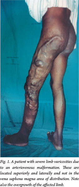 A 29-year-old man with a lifelong history of varicosities of the left lower limb presented with painful swelling of that leg. He had undergone surgery on the same leg 12 years earlier for removal of varicose veins. He had varicosities on the lateral and posterior aspects of both lower limbs as well as the gluteal region. There were dystrophic skin changes on the legs but no ulcers. There were no bruits over the varices. Arteriography showed extensive AV malformations of the popliteal, anterior and posterior tibial and peroneal vessels. The patient was managed with compression stockings. Fig. 1 depicts a similar case in which the AV malformation was unilateral. The patient first presented to us, was correctly diagnosed, and was managed similarly.