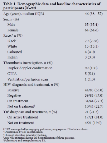RESULTS. Ninety-nine participants with confirmed thrombosis met the inclusion criteria. Participants were predominantly black (79.8%) and female (64.6%), with a median age of 46 (interquartile range (IQR) 38 - 57) years. The prevalences of HIV and TB were 53.0% and 21.2%, respectively. The most common risk factors for thrombosis were TB (17.2%) and malignancies (14.1%). Thrombophilia screening had a low diagnostic yield. The median time to target international normalised ratio during hospitalisation was 5.5 (IQR 4.0 - 7.0) days and the median duration of hospitalisation was 9 (IQR 7 - 11) days. The overall mortality rate in the cohort at 3 months post hospitalisation was 12.1%.
