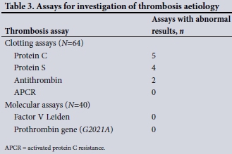 Assays to investigate the cause of the thrombosis were performed in 64 participants on admission. All 64 had clotting assays done, while only 40 had molecular tests performed. The thrombophilia screening results are summarised in Table 3. The 64 clotting assays performed revealed a total of six abnormal results. There were no abnormal molecular results.