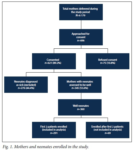 Out of a total of 6 179 deliveries conducted between 08h00 and 14h00 on weekdays over a 21-month period, a total of 696 pregnant women were approached for informed consent, with 75 (10.8%) refusing consent. Neonates of 276 mothers were assessed to be sick by the attending doctor and were therefore excluded. A total of 345 mothers with 360 well neonates were enrolled, and 291 mothers and neonates were included in the final analysis (Fig. 1). Neonates who were enrolled on the same day after the first two neonates had been enrolled were excluded (n=69). There were more women enrolled during the autumn and winter months than other months, as the enrolment period was 21 months which included two autumn, winter and spring seasons, and there was slow enrolment towards the end of the study because we lost the services of our research assistant.