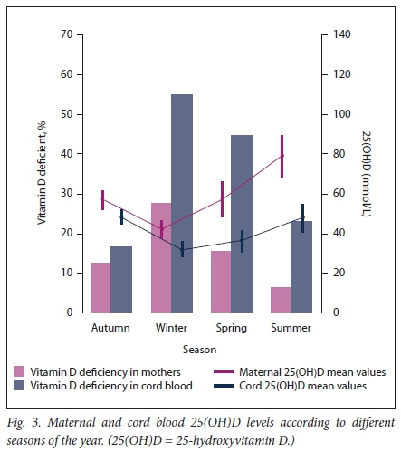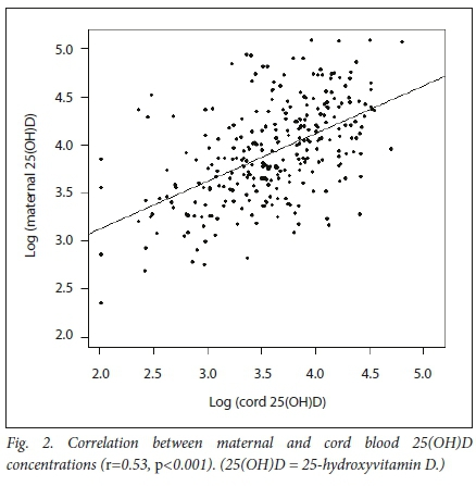 RESULTS. A total of 291 pregnant women and their healthy neonates were enrolled over a 21-month period. Mean (standard deviation) maternal and cord blood 25(OH)D levels were 57.0 (29.7) and 41.9 (21.0) nmol/L and the prevalence of VDD was 15.9% and 32.8%, respectively. On average, concentrations of 25(OH)D in cord blood were ~80% of those in the mother. There was no association between cord 25(OH)D and gestational age, but levels were associated with birth weight (p<0.001). There were no differences in maternal or cord blood 25(OH)D levels between those HIV-infected or uninfected. The predictor of VDD in mothers was giving birth in winter (odds ratio (OR) 2.87, 95% confidence interval (CI) 1.47 - 5.61), and in neonates the predictors were maternal age (OR 16.5, 95% CI 1.82 - 149), being born in winter (OR 3.68, 95% CI 2.05 - 6.61), being born by caesarean section (OR 4.92, 95% CI 1.56 - 15.57) and being of low birth weight (OR 1.99, 95% CI 1.13 - 3.50).