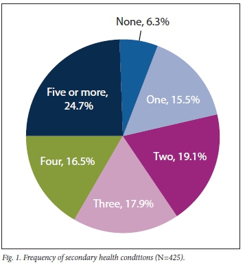 We found multimorbidity of SHCs, 24.7% of our patients having >5 SHCs. Multimorbidity is common in people with SCI, with 2-15 SHCs being reported in other studies.[9-11] The occurrence of multiple SHCs is indicative of the extent and severity of the problem. Having multiple SHCs has been shown to affect quality of life, functioning[20,28] and life satisfaction.[10] Managing more than two SHCs concurrently can lead to polypharmacy[29] and high demand for healthcare.[28] These findings must be considered when developing a preventive care model to target multiple SHCs and their associated risk factors.