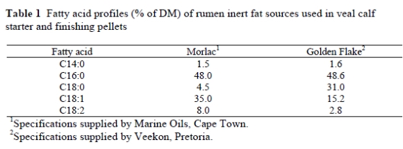 Fallon et al. (1986) found that the inclusion of low levels of calcium soaps in calf diets may be beneficial in allowing an increase in energy intake without affecting fibre digestibility. However, when the proportion of calcium soap in the concentrate was 0.10 or higher, intake was reduced and N-retention decreased. No data could be found in the literature where Golden Flake was included in calf diets. Three experiments were conducted by Fluharty & Loerch (1997) to determine the effect of supplemental Megalac (a calcium soap of palm fatty acids) in diets of newly arrived steers. Megalac was supplemented at levels of 0 or 2% in diets containing either 12 or 14% CP. Fat supplementation showed no benefit and they concluded that, with high CP concentrations or in diets containing supplemental ruminal escape protein, Ca soaps may be detrimental due to decreased dry matter intake. According to Brandt & Anderson (1990), however, fat supplementation increased daily gain, feed efficiency and estimated dietary metabolizable energy concentration.