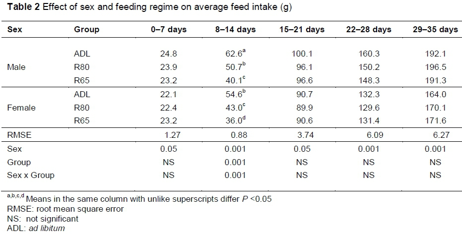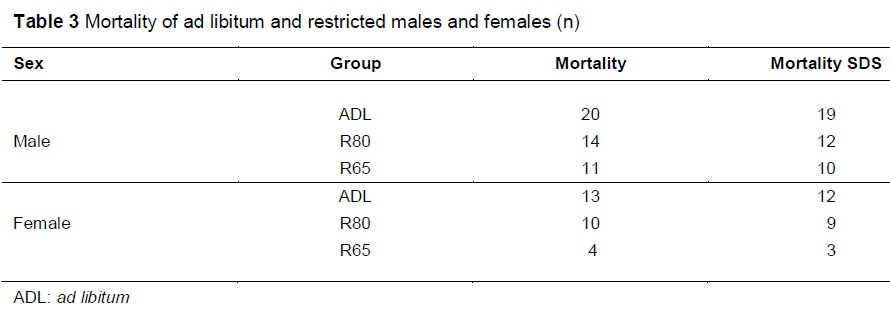 As expected, FI (Table 2) was significantly higher in males than in females throughout the experiment. Feeding regime affected FI only during the restriction period (P <0.001) when it was reduced in the restricted groups, depending on the given amount of feed (80% and 65% ADL). A significant interaction of sex and feeding regime (P <0.001) at this age showed that ADL females consumed less feed than males. Mortality (Table 3) over the five-week period decreased in the restricted groups: in males by 30% for R80 and 45% for R65; and in females by 23% in R80 and 70% in R65. The lower mortality was associated with a lower incidence of SDS, which was the main cause of mortality in this trial.