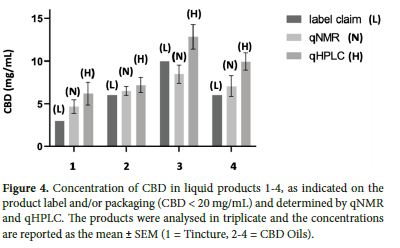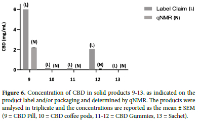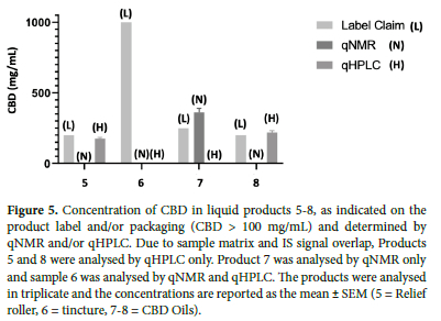 From the analysed products, 8 cannabis-based products were analysed using both qHPLC and qNMR, and out of all these eight products, only one product was found to be accurately labelled in terms of CBD concentration and the absence of THC, while the other products were found to have some degree of incorrect labelling. One product label indicated that 10 mL of the product contained 1000 mg of CBD, however, CBD was not detected using both NMR and HPLC.