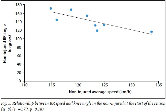 No correlation was found between knee angle and BR speed for the group as a whole. Controversy exists in the literature with regard to the role of the front knee angle and BR speed.[7,4,5] Wormgoor et al.[5](r=0.52; p=0.005) and Portus et al.[4](2004) (r=0.37; p=0.02) found statistically significant, although moderate to low correlations between a front knee angle and BR speed, while Portus et al.[7](2000) did not find a statistically significant correlation. The sample sizes of those studies which indicated a statistically significant correlation were 28'51 and 42'41 bowlers respectively, while lower sample sizes were included in this study (n=17) and that of Portus et al.[7](n=14). With larger samples even fair correlations will show statistical significance (p<0.05). Also, previous studies did not investigate a potential correlation between BR speed and injury status separately, while in this study bowlers who remained injury free throughout the season bowled with a more flexed knee while still attaining higher BR speeds, as indicated by the good to excellent inverse correlation (r=-0.79; p=0.18). Bowlers who remained injury free may have used strategies other than the front knee angle, like neuromusculoskeletal control such as balance and proprioception, to attain higher BR speeds. Both balance[14] and proprioception[17] have been associated with injury in previous research among pace bowlers.