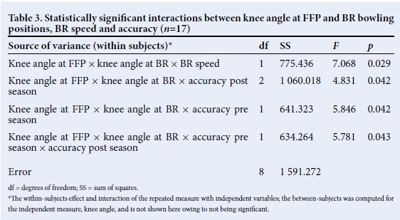 Descriptive statistics for knee angle and BR speed are shown in Table 2. No statistically significant difference between preseason and postseason knee angle for the group as a whole was found for knee angle at FFP (p=0.30) or at BR (p=0.17). Average BR speed for the group was similar at the start and end of the season (p=0.26). No statistically significant relationship was found between knee angle and injury (ANCOVA). Statistically significant within-subjects interactions were found between knee angle, BR speed and accuracy (ANCOVA) (Table 3). Paired t-tests revealed no statistically significant difference between knee angle as measured at the start of the season and knee angle at the end of the season in the injured group. However, a difference was found among bowlers who remained injury free during the course of the season, between the preseason knee angle of 157.07° (12.02°) and postseason knee angle of 163.95° (6.97°) in the FFP position of the bowling action (p=0.01).