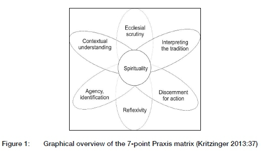 In the argument below, I utilise the praxis matrix, as developed in the discipline of Missiology at the University of South Africa (Unisa),4 as an evaluative framework in reading the responses. I specifically draw on the 7-point praxis matrix developed by Klippies Kritzinger (2008). The centrality of spirituality and the general emphasis on praxis in relation to an ecclesial community and its discernment for future action made this appropriate for the broader project on leadership and spirituality, of which this article forms part.