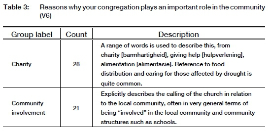 While the importance of the DRC in the country, at large, is closely linked to public witness and social infrastructure, the importance of the local congregation in the local community is overwhelmingly linked to discourses of charity and general community involvement. In both instances, there is a clear sense that this involves the community, at large - beyond the members of the church, but also beyond the White Afrikaner community typically forming the local congregation. These two clusters of responses were mentioned with much greater frequency than all the other ways in which young ministers motivate their position regarding the important role the local congregations play in the community.11