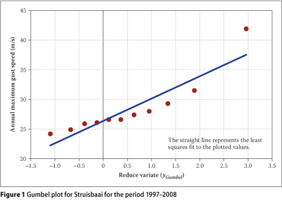 As an example, the graphical method is applied to the annual extreme wind gust data for Struisbaai, on the southern Cape coast, which is presented in Table 1. In the third column the wind gust values are shown in increasing order, xm, from the smallest to the largest, from which the plotting positions F(xm) were determined from Equation 5. Values for the reduced variate, yGumbel, could then be calculated with Equation 4.