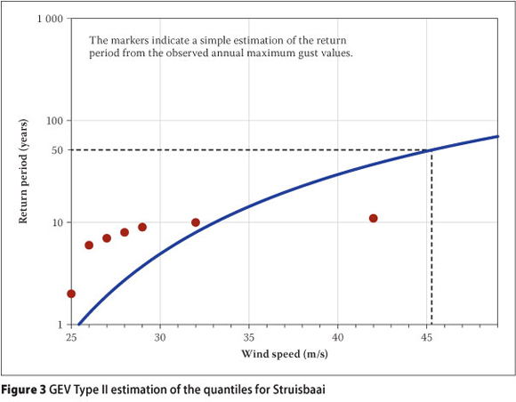 Figure 3 presents the fitting of the GEV distribution to the annual maxima of the wind gusts of Struisbaai, for which the value of the κ parameter was estimated as -0.47, i.e. a very strong form of Type II. Interesting to note is that, while the quantile estimations for the Type II is much higher than Type I for the longer return periods, the quantile estimations for the shorter return periods, e.g. ten years, are actually lower, due to the shape of the distribution.