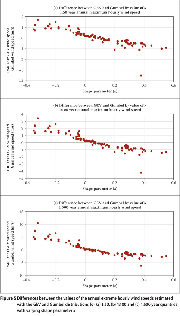 Figures 4 and 5 illustrate the annual extreme wind gusts, and annual maximum hourly mean wind speeds estimated with the GEV and Gumbel distributions differ as a function of the value of κ. As can be expected, a negative value of κ corresponds to a quantile value estimated with the GEV distribution to be higher than that estimated with the Gumbel distribution. This is because a negative shape parameter implies a thicker tail of the GEV distribution, compared to the Gumbel distribution.