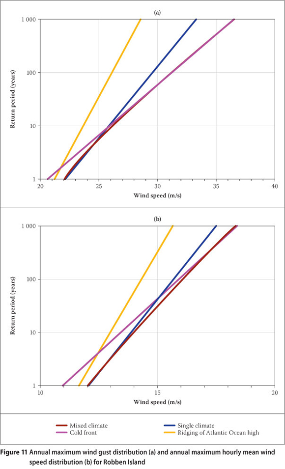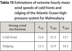 After the identification of the strong wind mechanisms involved at each weather station, the strongest wind gusts and hourly mean wind speeds were determined which were caused by each of the identified mechanisms, for each year of available data. An example of the results of this procedure is presented in Table 8, for the weather station at Robben Island. Here the annual maximum wind gusts, as well as the annual maximum hourly winds, are caused by two mechanisms, namely the passage of cold fronts and the ridging of the Atlantic Ocean high-pressure system. The maximum wind gust values and hourly mean wind speeds produced by each of the mechanisms are also given.