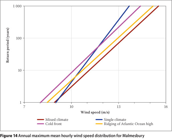 Another interesting example is that for the extreme hourly mean wind speed distribution for Malmesbury. Table 13 presents the maximum hourly mean wind speed values produced by the passage of cold fronts and the ridging of the Atlantic Ocean high-pressure system at Malmesbury, for the period 1992 to 2008. Cold fronts are the causes of the annual maximum hourly mean wind speeds on six of the available 17 years of data, while the ridging of the Atlantic Ocean high-pressure system is the cause for the remaining 11 years. The average of the annual maximum values for the cold fronts is 8.6 m/s, while for the ridging it is 9.0 m/s. The value of a for the cold fronts is 0.9, while for the ridging it is 1.0. Therefore the extreme hourly wind distributions for cold fronts and ridging are very similar. However, the mean of the annual maximum hourly mean wind speeds, regardless of the cause, is 9.4 m/s and a is equal to 0.7. The result is an extreme wind distribution as presented in Figure 14. The slope of the mixed climate distribution is similar to the distributions for cold fronts and ridging, while the single climate slope for the traditional Gumbel method is much steeper, causing a significant underestimation of wind speeds for the longer return periods.