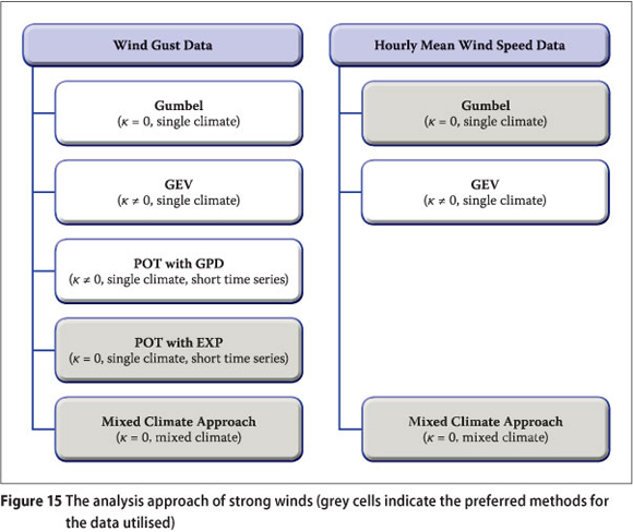 For wind gusts, in the case of wind data of single climatic origin, the POT approach applied with the EXP method is recommended. In the case of a strong wind climate of various origins the mixed strong wind climate approach is recommended, especially for longer return periods where the quantile estimations by the mixed climate method become much larger than that with the traditional Gumbel method. It is not feasible to apply the POT method to a mixed climate approach, due to the large number of strong winds of which the causes would have to be determined.