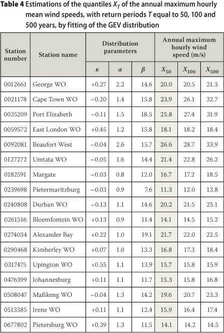 In analysing the wind data, a range of threshold values were selected in 2.5 m/s increments. The data sets extracted according to these thresholds were then checked to identify the data set with the largest number of wind speed values and a value of ε that is at least 0.8. The GPD was then fitted to the selected series of values. The POT method is not compatible with hourly mean wind speed data, with too high percentages of values, even with very high thresholds, showing dependency. Table 5 presents the quantiles XT of the annual maximum wind gusts for return periods T equal to 50, 100 and 500 years, for the weather stations in Table 2, by application of the POT method. In Kruger (2011) the number of values n that could be selected varied widely between stations, with λ (the average number of values per year) ranging from 1.50 to 19.20. A high value for λ indicates a better separation of individual storms than when λ is low, because a larger number of independent strong wind values could be utilised. A low value of λ indicates that the strong winds tend to be clustered in the time series. It is, therefore, not surprising that the weather stations in those regions in the interior where thunderstorms are likely to occur frequently, exhibit in general higher λ values than those closer to the coast, where synoptic scale systems tend to cause most strong winds.