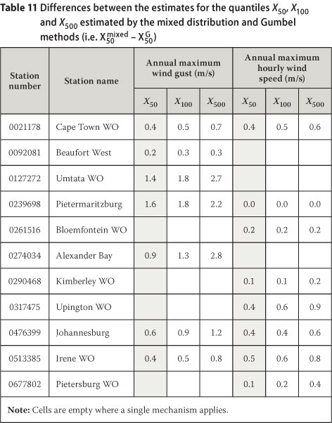 The differences between the values of the quantiles X50, X100, and X500, estimated by the method for mixed distributions and the Gumbel method, e.g. for the 1:50 year quan-tiles, are presented in Table 11, for the weather stations in Table 9. As expected, and also noted by Gomes & Vickery (1978), quantile estimations by the mixed distribution method are usually larger than the estimations by the Gumbel method, with the differences increasing with increasing return periods. In Kruger (2011), for X50 the mixed distribution method estimates are, on average, 0.7 m/s larger than the Gumbel method for annual maximum wind gusts, and 0.2 m/s larger for annual maximum hourly mean wind speeds. For longer return periods the mean differences become larger. For X100, the mean differences are 1.0 m/s and 0.3 m/s, while for X500 the mean differences are 1.7 m/s and 0.5 m/s respectively.