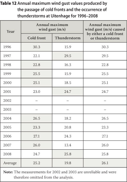 In the case of Uitenhage the most extreme wind gusts are caused by thunderstorms. Table 12 presents the annual maximum wind gust values, as well as the annual maximum values produced by the passage of cold fronts and the occurrence of thunderstorms at Uitenhage for the period 1996 to 2008.
