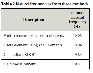 Table 2 compares the measured fundamental natural frequency with those obtained from the finite element and generalised SDOF models. The results are
