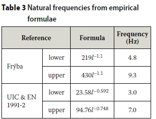 For comparison, the natural frequencies calculated by the empirical formulae suggested by Kaliyaperumal et al (2011) are shown in Table 3, where l is the bridge span in m. The values from Frýba (1996) are 95% confidence intervals for steel truss bridges, while the values from UIC (1979) and EN 1991-2 (2003) are limits outside of which more detailed analysis is needed. It appears that the bridge is near the upper end of Frýba's interval, and above the UIC and EN 1991-2 limit, though Frýba does state that, according to his data, many bridges will exceed this upper limit.