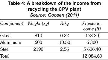 Income from recycling the plant's components during decommissioning, and the recycling of the batteries every four years, is also considered in the social analysis. The economic benefit from recycling the glass, aluminium and steel of the CPV plant is calculated to be R10 600.53 (R156.32 + R5 526.32 + R4917.89). The income from the recycling of batteries every four years is R48 661.05. Table 10 shows the income from recycling.