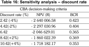 The social CBA yielded positive results, with a NPV of R125 616.64, an IRR of 8 percent (which exceeds the social discount rate of 5.97 %), and a BCR of 1.045.