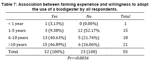 When the farming groups were cross-tabulated separately, in terms of their farming experience, and the willingness to adopt a biodigester, livestock farmers were statistically significant at Pr<=P 0.0280. Hence, livestock farmers with more farming experience were more likely to adopt a biodigester. There was also a significant relationship for farmers practising mixed farming at Pr<=P 0.0399. The association between farming experience and the willingness to adopt a biodigester technology by all participants was statistically significant at Pr<=0.0036 (Table 7). According to Ainembabazi and Mugisha (2014), farmers with more experience in farming are more likely to adopt new technologies by observing the performance of their traditional technologies and their practical suitability in farming operations. Thus, farmers with more experience could realise the need to adopt a biodigester based on their experience about traditional technologies they are using.