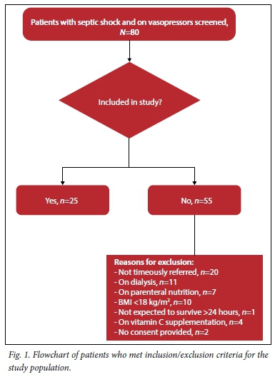 This prospective study was conducted in the intensive care unit (ICU) of a tertiary academic hospital. Patients with septic shock expected to survive more than 24 hours were enrolled within 12 hours of the commencement of vasoconstrictor support. Septic shock was defined as two or more systemic inflammatory response syndrome criteria, a proven or presumed source of sepsis and a systolic blood pressure of <90 mmHg, or the need for vasoconstrictors after adequate volume resuscitation. Exclusion criteria applied at screening included the following: underweight (body mass index (BMI) <18 kg/m2), patients unlikely to survive more than 24 hours, parenteral nutritional support, pregnancy, gastrointestinal fistula or other considerable exudative losses, renal dialysis, or more than 100 mg vitamin C supplementation during the previous 7 days. The study was approved by the Human Research Ethics Committee of the Faculty of Health Sciences, University of Cape Town (UCT) (Ref. UCT/FHS/HREC 528/2011). Due to the observational nature of the study and the minimal risk to the participants, we were permitted to utilise a deferred informed consent procedure where patients were enrolled in the study when they met the eligibility criteria. Blood samples and collected data were stored until the patient was well enough to give written informed consent for the use of such data. If the patient declined participation, all data and derived data were excluded from the study and destroyed. If a patient died before deferred written informed consent could be obtained, informed consent was waived and we were permitted to use the data.