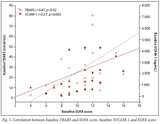 The associations between oxidative stress (TBARS) and severity of illness as indicated by SOFA score, and between SOFA and sVCAM-1 scores, were also determined (Fig. 5). A positive correlation was found between TBARS and SOFA score. Baseline high sVCAM-1 levels were also associated with high SOFA scores.